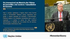 O mundo assinala, a 25 de março, o Dia Internacional em Memória das Vítimas da Escravatura e do Tráfico Transatlântico de Pessoas Escravizadas, uma efeméride instituída pela Organização das Nações Unidas com o propósito de honrar milhões de homens, mulheres e crianças submetidos ao maior sistema de exploração forçada da história.